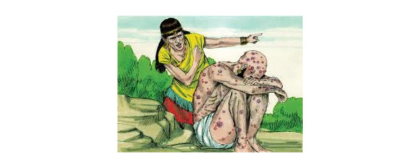 Сатана отошел от лица Господня и поразил все тело Иова страшною проказою от подошвы ног его по самое темя головы. Страдалец должен был выселиться из среды живых людей, так как был нетерпим между ними по заразительности охватившей его болезни. Тело его покрылось отвратительными, смрадными струпьями, по всем суставам разливался жгучий внутренний огонь, сидя, вне селения, в пепле, Иов обломком черепка скоблил свои гнойные раны. Все соседи его и знакомые отстранились, оставили его. Даже жена его утратила сострадание к нему.