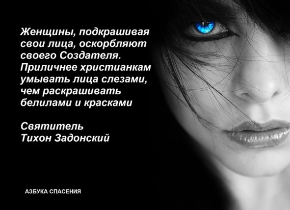 И, чтобы не явиться соблазном и причиной гибели хоть одной души человеческой от телесной красоты твоей, смой с себя всю косметику и удали из дома принадлежности к украшению и благоуханию твоего тлеющего во времени тела, и относись к нему более как к врагу, чем другу, и которое может явиться причиной погибели бессмертной души твоей. Одевайся не броско и невзрачно, прикрывая одеждой все члены тела, чтобы не привлекать к себе внимания и не явиться причиной похотливого соблазна. Всегда помни, что временная красота твоего тела дарована Богом только для мужа, но при неразумном и не осторожном пользовании ей, она может явиться причиной гибели и других душ, в следствие чего погибнет и твоя душа, как нарушившая заповедь Спасителя.