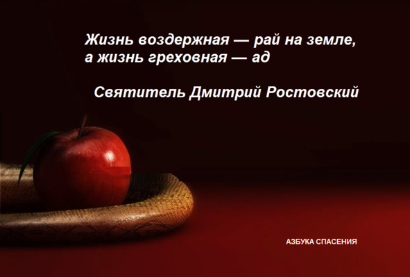 От объедения и пьянства происходит не только душе вред, но и телу болезнь, от воздержания же и трезвости не только душе польза, но и телу здравие и легкость жизни; объедение и пьянство лишают не только вечной жизни, но и временной – погубляют вместе и душу, и тело, вообще, делают человека непотребным Богу и людям. Временная сласть готовит человеку вечную горесть, если кто к ней безумно прилепляется. Жизнь воздержная и трезвая – рай на земле, а жизнь растленная и греховная – ад на земле и превеликое томление.