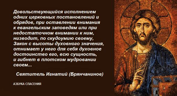 Церковные постановления очень полезны и нужны как для каждого христианина, так и для христианского общества, доставляя поведению порядок и правила, порядок и правила способствуют жизни благочестивой, но заповеди должны быть душою каждого христианина и христианского общества. Спаситель мира дал должное место, должную цену и отеческим преданиям, и заповедям Божиим. Сия, то есть предания Отцов, подобаше творити, сказал Он, и онех, то есть заповедей Божиих, не оставляти. От соблюдения постановлений Святой Церкви исполнение заповедей делается особенно удобным, а жизнию по заповедям точное соблюдение церковных постановлений охраняется от тщеславия, лицемерства и плотского мудрования. Закон Божий – духовен, Евангельские заповеди Дух суть и живот суть. Но как человек состоит из души и тела, то оказались нужными наружные обряды и постановления. Они соединены с духом Закона. Довольствующийся исполнением одних церковных постановлений и обрядов, при оставлении внимания к евангельским заповедям или при недостаточном внимании к ним, низводит, по скудоумию своему, Закон с высоты духовного значения, отнимает у него для себя духовное достоинство его, всю сущность, и гибнет в плотском мудровании своем и по причине плотского мудрования своего.