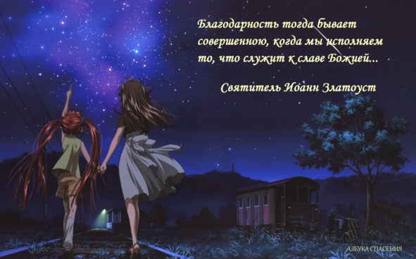 Станем же благодарить за благодеяния, не только нам оказанные, но и другим, таким образом, мы в состоянии будем истребить и зависть, и утвердить любовь и сделать ее искреннейшею. Ты уже не в состоянии будешь завидовать тем, за кого благодаришь Господа… Такое благодарение освобождает нас от земли и переселяет на небо и делает из людей ангелов.