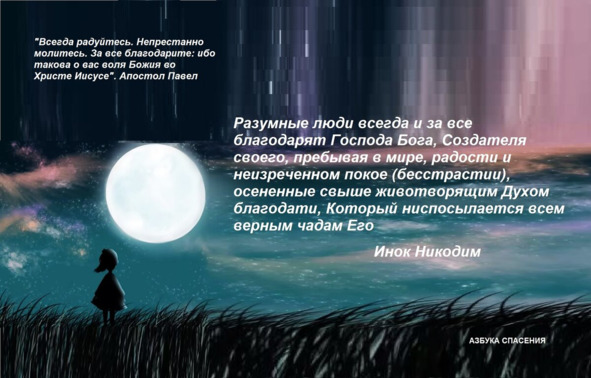 Разумные люди всегда и за все благодарят Господа Бога, Создателя своего, пребывая в мире, радости и неизреченном покое, осененные свыше животворящим Духом благодати, Который ниспосылается всем верным чадам Его.