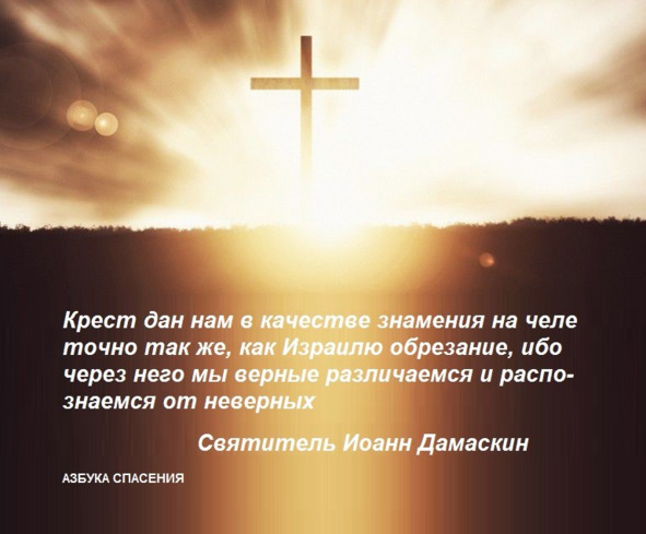 Не удивительно, что крест стал знамением христианина. «Крест дан нам в качестве знамения на челе точно так же, как Израилю обрезание; ибо через него мы верные различаемся и распознаемся от неверных» (св. Иоанн Дамаскин, слово в день Креста).