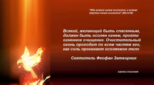 Итак, принеси жертву, болезненную и скорбную здесь, чтоб избежать мучений там. Без огненного очищения здесь нельзя быть спасену от огня вечного. Всякий, желающий быть спасенным, должен быть осолен огнем, пройти огненное очищение. Все мы по закону сотворения должны принести себя в жертву Богу, но всякий из нас нечист. Надо, значит, очистить себя, чтобы из нас составилась Но стань себя очищать, отрывать страсти от души, будет больно, как от обожжения огнем. жертва, приятная Богу (Рим.12:1).