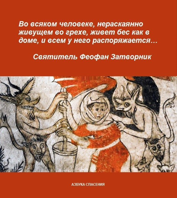 Во всяком человеке, нераскаянно живущем во грехе, живет бес как в доме…Когда по благодати Божией такой грешник приходит в сокрушение о грехах своих, кается и перестает грешить, – бес из него изгоняется. Сначала он не беспокоит покаявшегося, потому что в нем на первых порах много ревности, которая как огонь жжет бесов и как стрела отражает их. Но потом, когда ревность начинает охладевать, подступает и бес издали со своими предложениями, вбрасывает воспоминание о прежних удовольствиях и вызывает к ним. Не поостерегись только покаянник – от сочувствия скоро перейдет к желанию; если и здесь не опомнится и не возвратит себя в состояние прежней трезвенности, то падение недалеко.