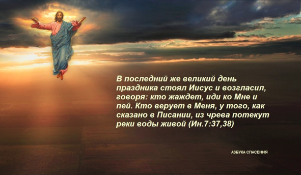 В последний же великий день праздника стоял Иисус и возгласил, говоря: кто жаждет, иди ко Мне и пей. Кто верует в Меня, у того, как сказано в Писании, из чрева потекут реки воды живой. Сие сказал Он о Духе, Которого имели принять верующие в Него: ибо еще не было на них Духа Святаго, потому что Иисус еще не был прославлен (Ин.7:37—39).