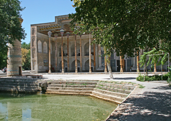 Если завернуть за Боло-Хауз в западном направлении, то можно пройти в парк культуры и отдыха имени Саманидов, где расположен мавзолей Исмаила Самани, а по пути полюбоваться зданиями медресе Абдулла-хана (строилось с 1588 по 1590 год) – фото 7 и медресе Мадари-хан (строилось в 1566—1567 годах) – фото 8.