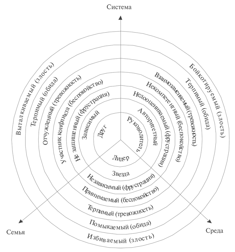 В каждой из сфер мы выделили семь ролей примерно одного уровня по статусу (занимаемым позициям), ранжировав их по мере убывания основополагающей ценности, присущей этой сфере. В системе (коллективе): компетентный руководитель, авторитетный помощник, формальный помощник, уважаемый член коллектива, рядовой сотрудник, терпимый, бойкотируемый. В семье: любимый глава семьи, зависимый любимец, признаваемый без привязанностей, полагающийся на себя, занимающий одну из сторон конфликта, квартирант, выталкиваемый. В среде неформального общения: лидер, звезда, независимый, примыкающий, зависимый, помыкаемый, избиваемый. Понятно, что в отроческом возрасте роли и позиции осознаются еще весьма расплывчато, конфликт между ними будет осмыслен не скоро, но эмоциональная почва психологической защитной реакции закладывается именно сейчас.