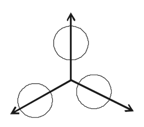 В точке, взятой за центр композиции, располагаются лучшие роли по всем трем сферам. Из точки под углом 120° исходят три луча. На них мы произвольно откладываем отрезки соответственно тому масштабу, который взяли, по количеству принятых позиций (в нашем случае их семь, но это число взято исключительно для удобства; теоретически их может быть необозримо много).