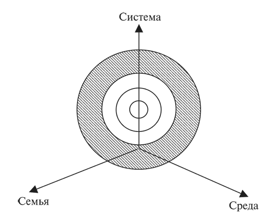 В пространстве, обозначенном тремя сферами (семья – система – среда – рис. 11), личность подростка, воспитанного в обстановке педагогической депривации, будет располагаться, естественно, ближе к системе. Вплоть до того, что воспринимать ее как «экологическую нишу» с теми защитными механизмами, которые будут обращены к семье и среде. В то же время, консистенция самой личностной структуры будет неоднородной. Слой ролей-функций мы закрасили темной штриховкой, чтобы показать их закоснелость. Остальные же слои (статусы и принципы) будут инфантильно-расплывчатыми, недостаточно развитыми, на них невозможно опереться, тем более – соприкасаться ими с реальной жизнью.