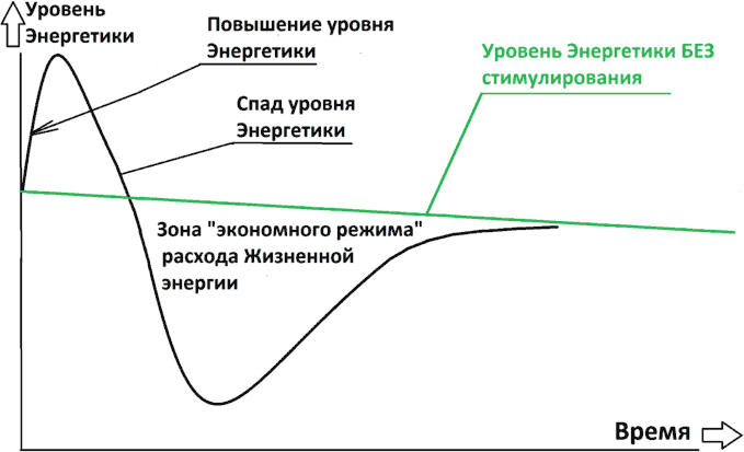 В первой части книги мы подробно описали различные процессы стимулирования расхода Жизненной энергии. Как результат – повышение Энергетики на некоторое время (зависит от силы воздействия, качества и количества стимулятора). А затем последующий длительный период «экономного режима» расходования Жизненной энергии, соответственно, период низкой Энергетики.