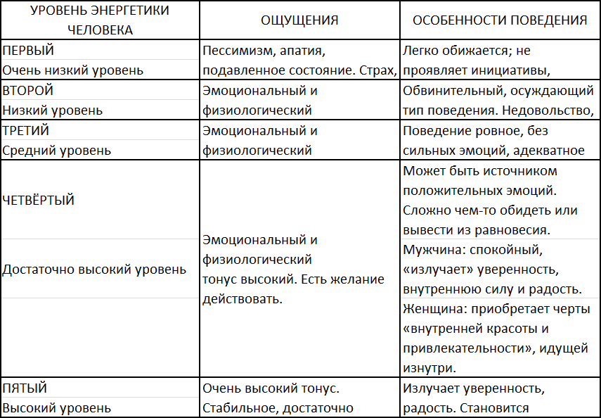 Каждый уровень Энергетики будет соответствовать определённому образу поведения человека. Это можно представить в виде следующей таблицы: