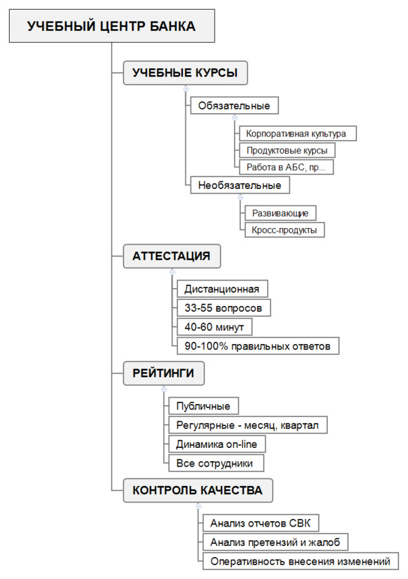 Количество вопросов в аттестационных тестах должно варьироваться от 35 до 55 (из расчета времени прохождения аттестации 40—60 минут). Процент правильных ответов для успешной аттестации не должен быть меньше 90%. Необходимо стремиться, чтобы вопросы к тестам носили максимально приближенный к клиентскому обслуживанию характер, например, «отметьте документы, которые должны храниться в досье клиента», «каков лимит выдачи наличных по кредитной карте», «можно ли выдать кредит физическому лицу, не имеющему прописки в данном регионе» и пр.). Список вопросов должен составлять соответствующий продуктовый менеджер, продвигающий данный продукт. В этом ему может помочь анализ типовых ошибок, которые делают сотрудники банка при оформлении продажи банковского продукта (необходимо сделать соответствующий запрос последних проверок СВК банка или попросить СВК осуществить выборочную проверку правильности оформления документов в точках продаж и корректности заведения их в АБС банка). При обнаружении нарушений сотрудниками точек продаж регламентов и технологий оформления продуктов, необходимо оперативно вносить в вопросы соответствующие дополнения. Учебный Центр должен получать результаты проверок СВК и других проверяющих органов, для корректировки аттестационных вопросов.