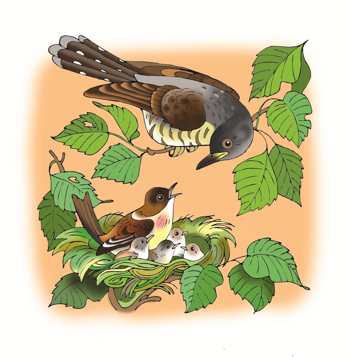 С тех пор Кукушка охраняет гнёздышко, но охраняет его от Лесной Птички и её птенцов.