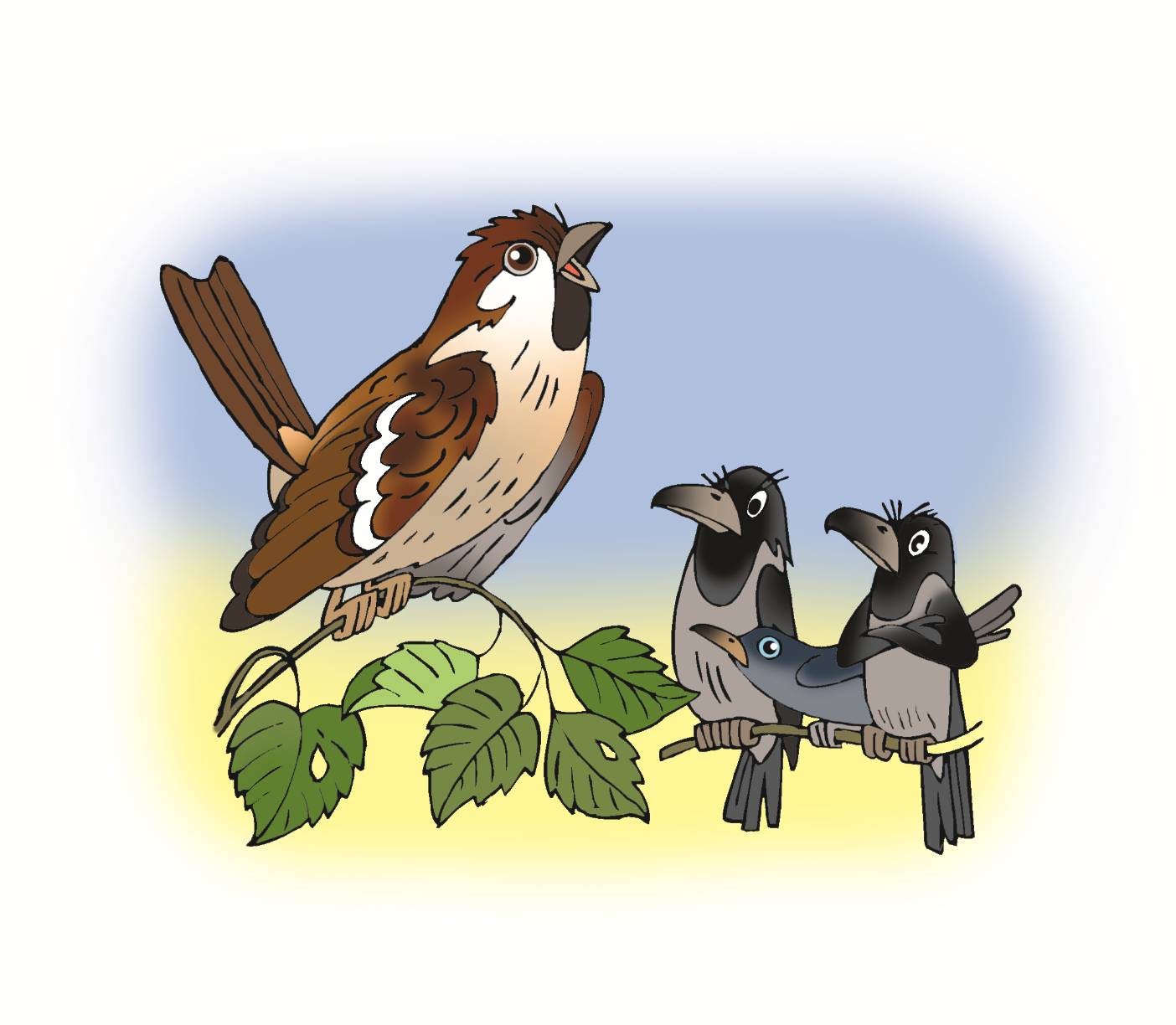 – Послушай, муженёк! – затараторила Воробьиха. – Зачем ты надрываешься? Тебе ли тягаться с Соловьём?