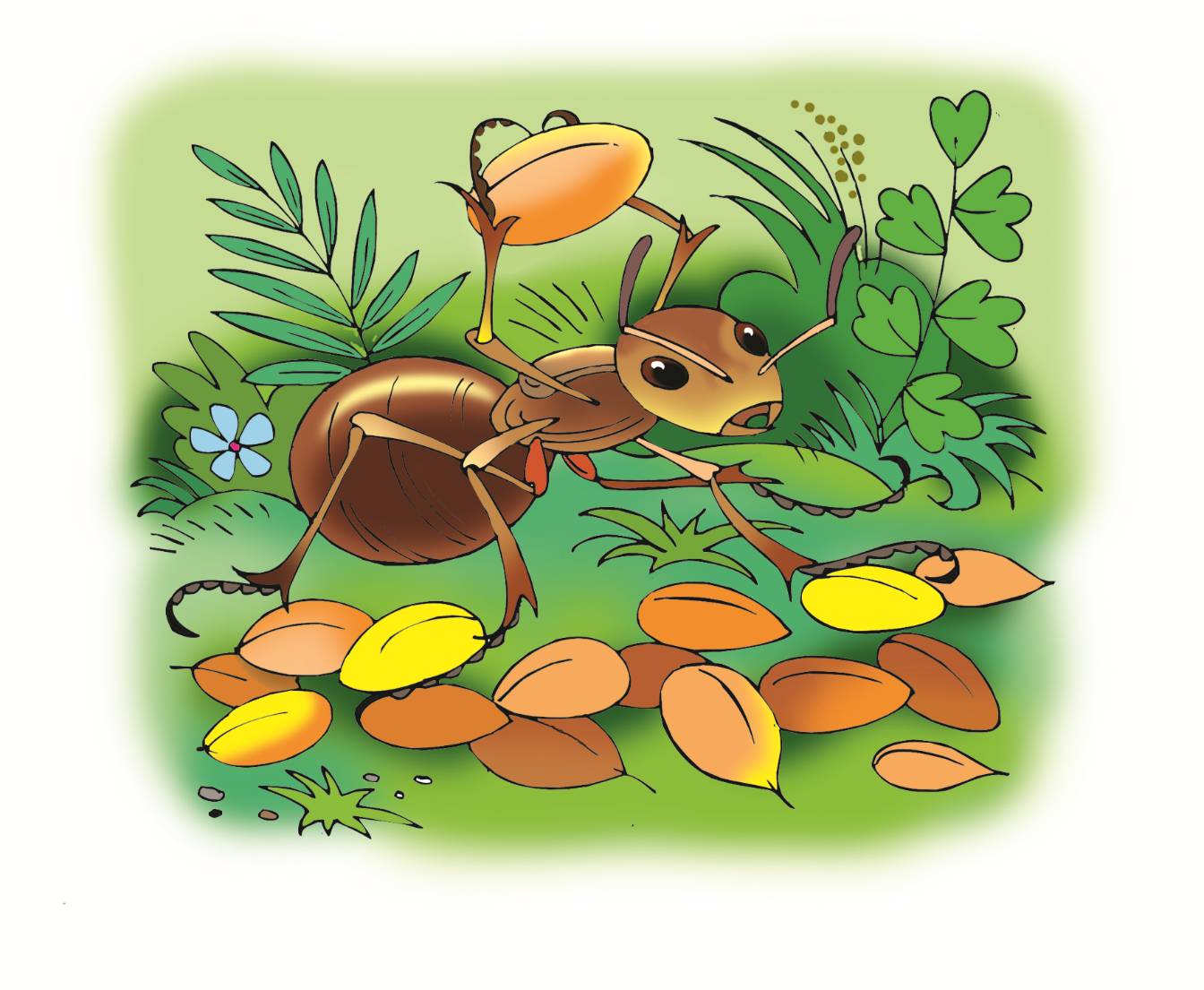 Увидел Муравей зёрна, подбежал, поднял одно и потащил в муравейник.