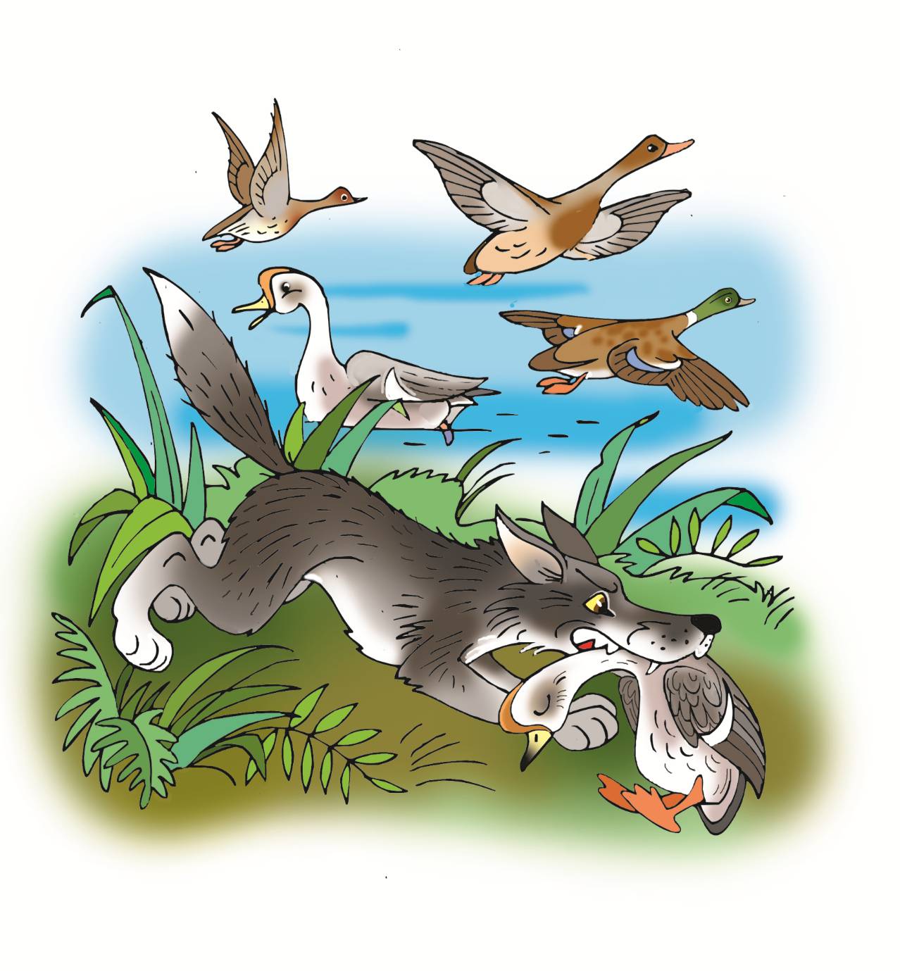 Вдруг мелькнула тень над водой, и неповоротливый Домашний Гусь оказался в пасти Лисы, а Дикие Утки легко взлетели и закружили над пустынным озером.