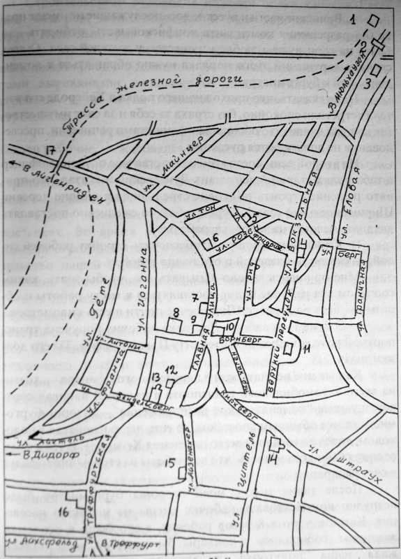 1. Железнодорожный вокзал. 2. Grenzhaus. Пограничный дом. 3. Kurhaus. Гостиница. 4. Дом Лизы Вальдхельм. 5. Водонасосная станция. 6. Ресторан-гостиница “Zum Grünen Rasen” (“У зеленой лужайки”). 7. Советская комендатура. 8. Фабрика “Вильгельм Крумбайн”. 9. Ресторан “Пост”. 10. Контора бургомистра. 11. “Der Наchelborn”. Источник Гахель. 12. Детский садик. 13. Новая кирха. 14. Старая кирха. 15. Детские ясли. 16. Школа имени Гёте. 17. Арочный мост.