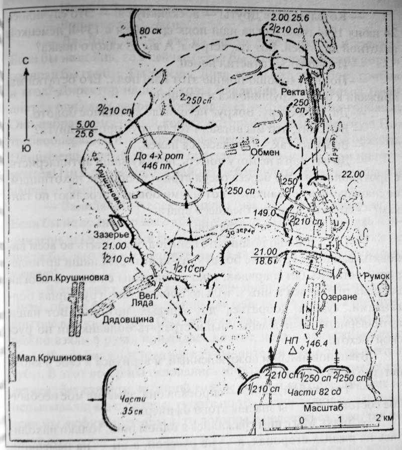 Карта-схема боя нашего полка 24–25 июня 1944 года в районе озера Крушиновка (Белоруссия) с 446-м немецким пехотным полком, один батальон которого был окружен и в полном составе взят в плен. В Хейероде я встретил немецкого офицера, возвращающегося из плена домой, участника этого боя.