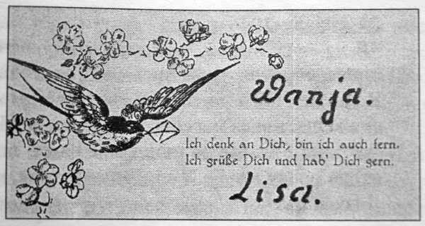 “…Вчера вечером я весь день пролежала в кровати, мне было плохо. Но сегодня мне уже гораздо лучше. Вчера я все время надеялась, а вдруг ты приедешь! Как я ни прислушивалась, но так и не услышала шума автомобиля. Ваня, 1-го февраля я снова буду с тобой, Ванечка. Пиши мне как можно чаще!”