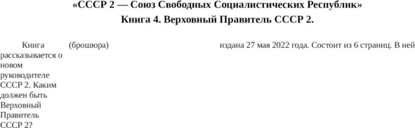 «Россия – СССР 2 (Книга 2)»Эта книга была издана 27 августа 2020 года, с объёмом страниц – 96. Презентация этой книги состоялась 6 сентября 2020 года на Международной Книжной Ярмарке (ММКЯ 2020) в г. Москве, в Манеже. На Ютубе есть видеозапись этой Презентации. В этой книге подробно рассказывается о государственном механизме работы СССР 2 – Союза Свободных
