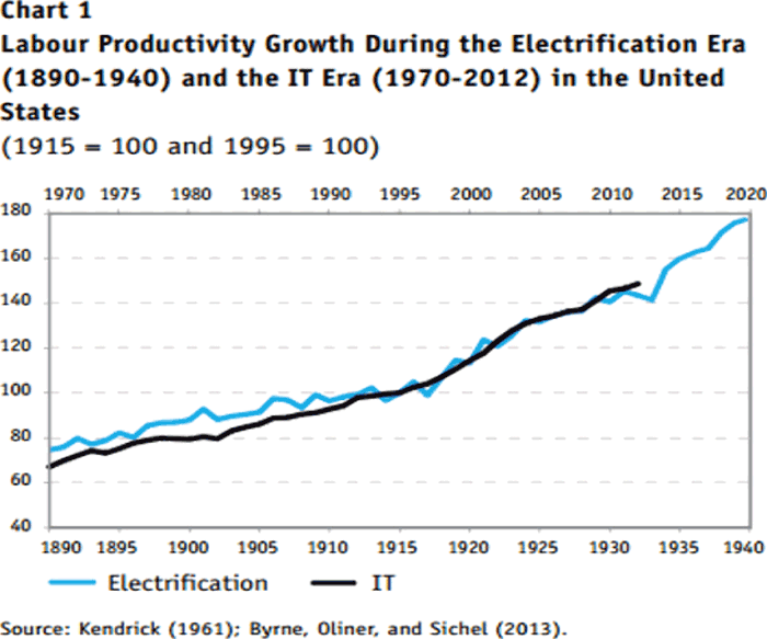 График на рис. 2.2, основанный на данных статистики США, дает возможность сопоставить рост производительности труда в эпоху электрификации в сравнении с эпохой информационных технологий (цифровизации). Мы видим, что при наложении друг на друга эти два независимых друг от друга графика показывают практически идентичный тренд роста производительности труда на 50-летнем промежутке времени, несмотря на весьма разные факторы и механизмы влияния на производительность в случае электрификации или цифровизации.