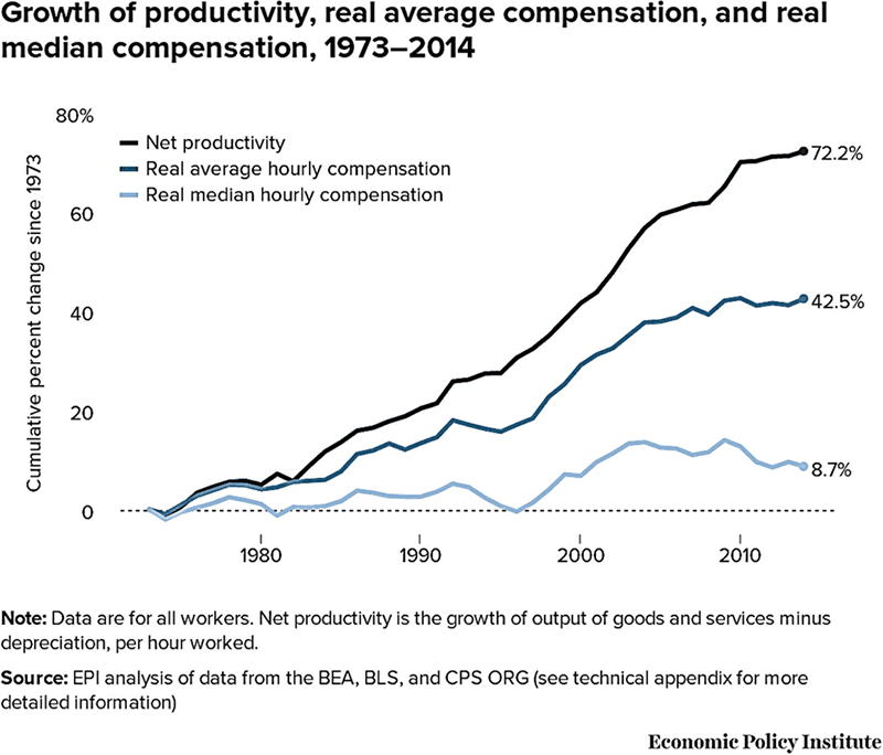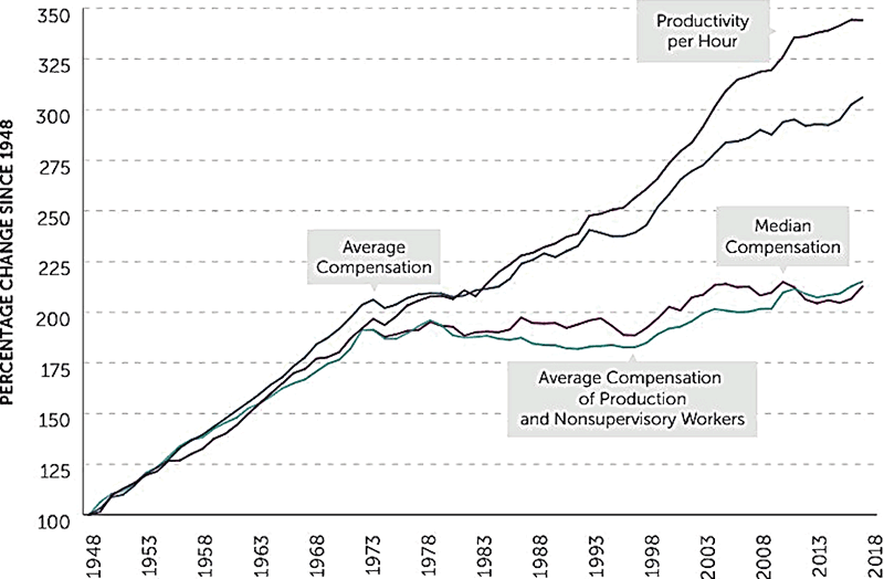 Начиная с 1970-х гг. эта связь начала разрушаться в значительной степени из-за снижения активности профсоюзов, изменений в антимонопольной политике и в финансовой структуре компаний, которые стимулировали наращивание долга над производительными капитальными затратами, и общего сочетания технологических сдвигов, переноса производств, появления целого класса работников на аутсорсинге (временные и подрядные контракты, то, что стало называться «уберизацией» труда, которые привели к снижению доходов по сравнению со штатными сотрудниками). Все это означало, что даже когда работники становились более продуктивными, они не пользовались плодами этого роста производительности.