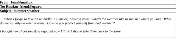 In your email, you ask me some questions about the weather, and I would like to answer them now. To tell the truth, the weather in summer is quite warm and mild here. The days are sunny, it seldom rains, mostly in August. You won’t believe it, but I like walking in the park under the umbrella, when it rains because I adore a romantic and a little sad mood of summer rains. You know, I usually take an umbrella with me and wear a raincoat. If it rains heavily, I put on Wellington shoes.