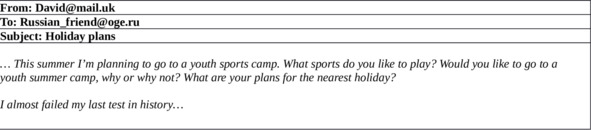In your email, you ask me some questions about my holiday plans, and I would like to answer them now. To tell the truth, I like to play team sports like football. My friends and I do it every weekend and have a lot of fun. Honestly speaking, I would like to go to a youth summer camp because I want to make new friends. You know, my plans for the nearest holiday is to go ice-skating and sledging in the park.
