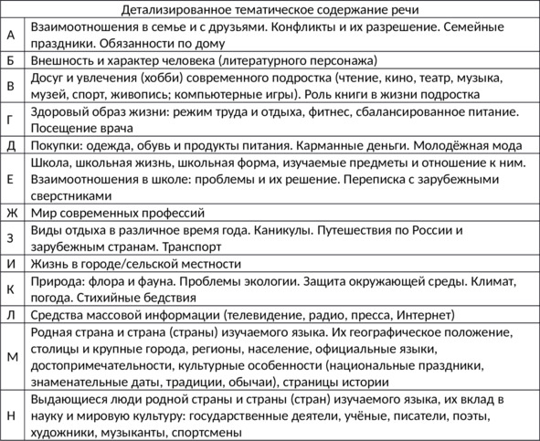 Ниже приведена детализация установленного ФГОС основного общего образования тематического содержания речи. Детализация проведена на основе федеральной образовательной программы основного общего образования.