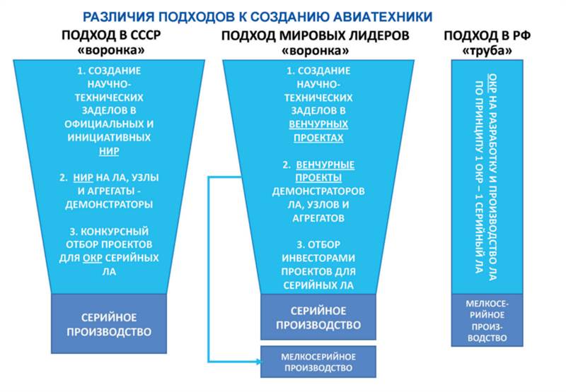 Мировые лидеры авиастроения также построили систему управления инновациями через создание исследовательских «воронок», с поправкой на институты рыночной экономики. Научно-технические заделы и демонстраторы технологий создаются в рамках венчурных проектов, из которых инвесторы и заказчики выбирают лучшие для крупносерийного производства. При этом созданы условия, чтобы венчурные проекты за счёт их авторов или привлечённых инвесторов могли реализовываться в мелкосерийном производстве, обслуживающем преимущественно авиацию общего назначения.