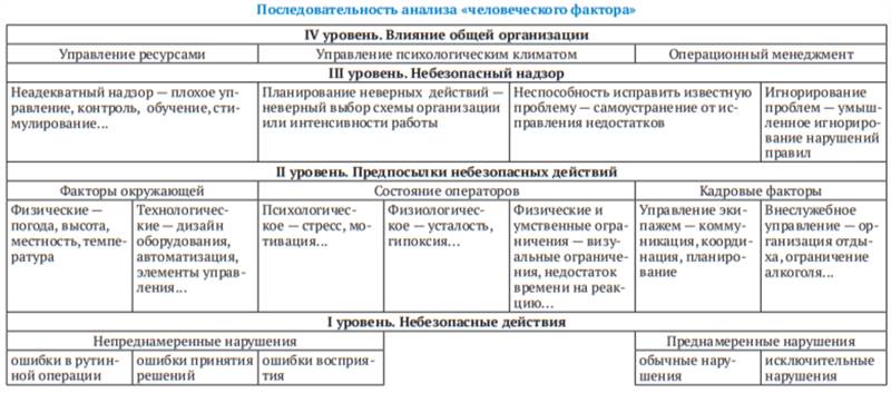 Более того, как показывает практика, российская авиасистема в значительной мере не соответствует даже стандартам II этапа эволюции, акцентировавшего внимание на человеческий фактор. Международные подходы к анализу человеческих ошибок, например, методология HFACS, разработанная С. Шаппеллом и Д. Вигманном315, выделяет 4 уровня возможных отказов (таблица 3.4).