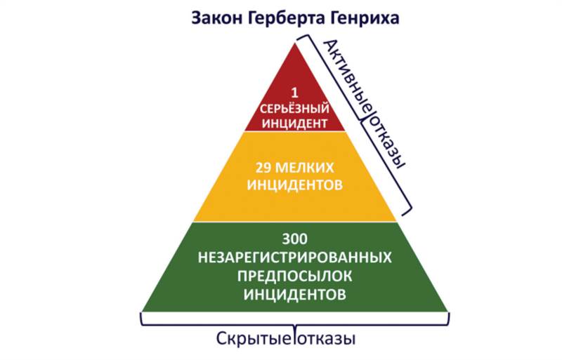 В соответствии с законом Герберта Генриха325 (рисунок3.18), на каждое серьёзное происшествие приходится 29 мелких происшествий и 300 мелких инцидентов, обычно нерегистрируемых. В контексте авиации борьба исключительно с «активными отказами» представляет собой обвинение задним числом пилота, диспетчера, авиационного инженера или техника в происшествии, имеющем гораздо более глубокие корни, нежели действия одного или нескольких ответственных исполнителей. Нацеленность исключительно на быстрое выявление в наказание виновника «активного отказа» приводит к тому, что даже флагман российского авиатранспорта—авиакомпания «Аэрофлот»—скрыла от Росавиации этот тяжёлый инцидент и предпосылку к авиакатастрофе. Но благодаря утечке информации из компании «Аэрофлот» в СМИ эта информация стала известна надзорным органам. Впоследствии стало известно ещё о нескольких случаях сокрытия «Аэрофлотом» авиационных инцидентов разной степени тяжести326.