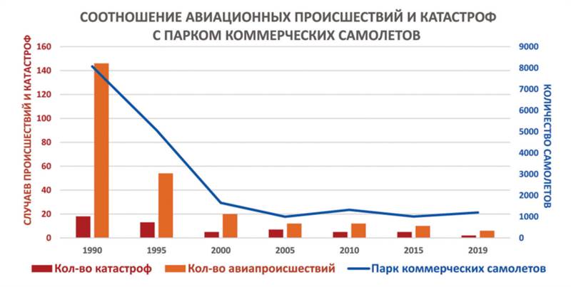 В России вплоть до 2020 г. наблюдалась почти 100%-ная корреляция между сокращением авиационных происшествий и катастроф и сокращением парка эксплуатируемых воздушных судов337 (рисунок 3.19). К 2020 г. отечественная авиасистема вплотную приблизилась к исчерпанию советского кадрового задела (к 2021 году самому молодому советскому выпускнику перевалило за 50). Последовательное сокращение парка воздушных судов долгое время позволяло регулятору поддерживать иллюзию относительно высокой безопасности отечественной авиации. В настоящее время отечественная авиасистема стала пожинать плоды постсоветского развития, подтверждая очевидное: деградация объёма перевозок в конечном итоге ведёт к деградации их безопасности. Приведённая статистика говорит о провале попыток отечественного регулятора по исключению любых рисков путём утверждения запретительных нормативов вне зависимости от вероятности наступления негативных последствий338.