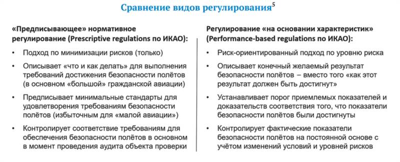 Совершенствование организационной структуры и оптимизация полномочий органов власти, а также организаций, ответственных за обеспечение отдельных элементов системы безопасности, необходимо, но недостаточно. Также необходим переход от «Предписывающего» нормативного регулирования (Prescriptive regulations) к регулированию, «основанному на характеристиках [конечного результата] » (Performance-based regulations)343. Внедрение риск ориентированного и основанного на цифровизации и саморегулировании отрасли подхода позволит осуществлять гибкое регулирование для каждого эксплуатанта и для каждого уровня рисков с обеспечением автоматизированного непрерывного мониторинга результатов деятельности каждого эксплуатанта по фактически достигнутым показателям безопасности полётов как конечного результата. Подход основан на Приложении 19 «Управление безопасностью полётов»344 и «Руководстве по управлению безопасностью полётов»345.