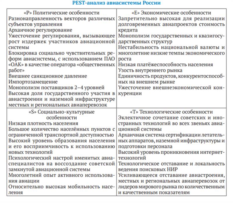 Совокупность политических, экономических, социокультурных и технологических особенностей, характеризующих уникальность национальной авиасистемы (PEST-анализ), прямо вытекает из предыдущих глав (таблица 4.1).