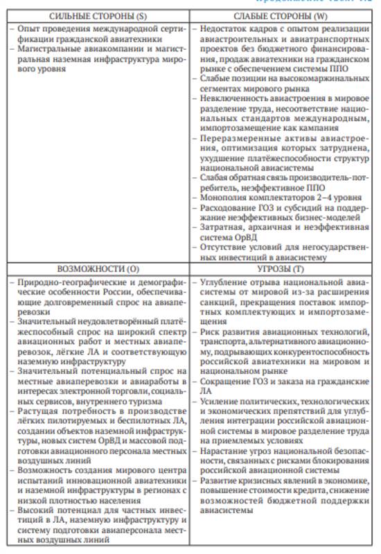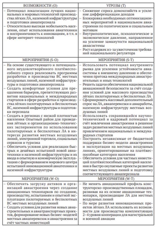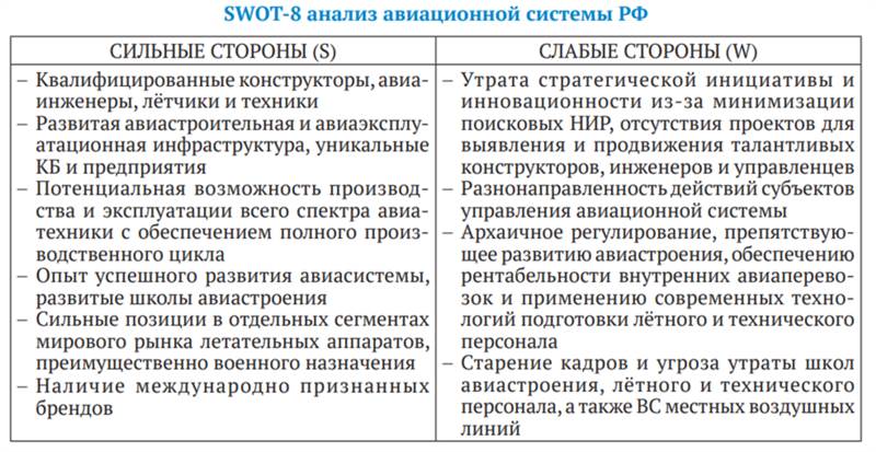 Для глубокого анализа сильных и слабых сторон национальной авиасистемы страны, существующих угрозы и возможностей (SWOT), а также вариантов выстраивания стратегии действий в сложившейся противоречивой ситуации, проведён SWOT-8 анализ (таблица 4.2, рисунок 3.1).