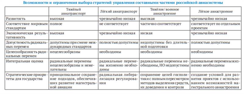 Из проведённого анализа российской авиационной системы вытекает следующее концептуальное видение подходов к формированию стратегий различных сегментов отечественной авиасистемы: