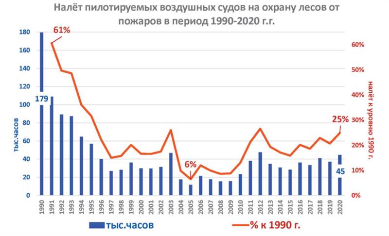 Для решения перечисленных задач минимально необходимы авиаработы в объёме не менее 100 тыс. часов в год, при оптимальном уровне не менее 180 тыс. часов в год (уровень, достигнутый в советское время), рисунок 4.10. Сегодня резко возросли шансы на получение внебюджетного финансирования лесоохранных работ. Эффективная борьба с пожарами позволит обеспечить почти двукратное улучшение российских показателей декарбонизации, что позволяет рассчитывать на формирование консорциума металлургических, сырьевых и перерабатывающих корпораций, заинтересованных в демонстрации международным структурам быстрого и статистически значимого результата, а также в организации PR-компаний, позиционирующих Россию как абсолютного лидера мировой декарбонизации и «зелёной экономики».