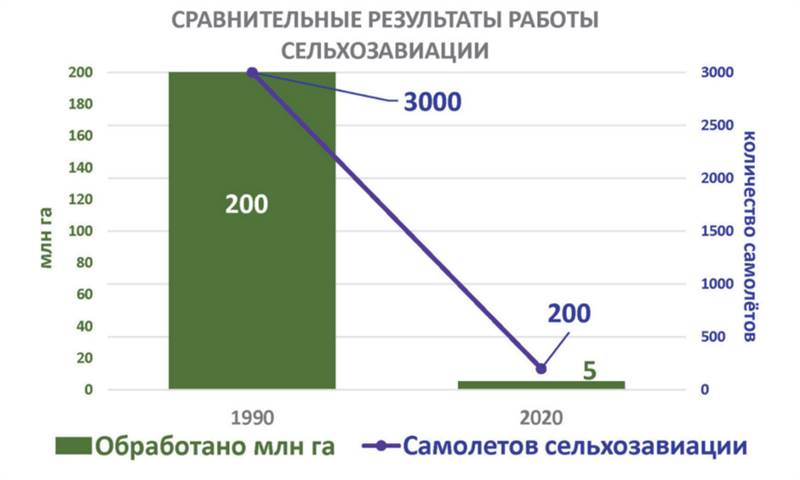 Даже однократная авиаобработка засеваемой площади, которая в 2020 г. составляла порядка 80 млн га, при средней стоимости производства авиационно-химических работ составляет 375 руб./га, сформирует спрос на сумму порядка 30 млрд рублей394 и потребность в 2,5–3 тыс. пилотируемых и беспилотных воздушных судов.