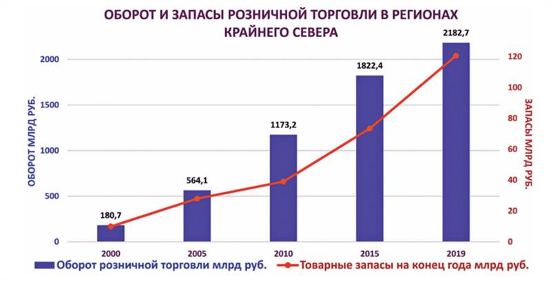 В период с 2000 по 2019 год оборот розничной торговли в районах Крайнего Севера и приравненных к ним местностях376, несмотря на сокращение общей численности населения с 11 млн чел. до 9,9 млн чел., увеличился более чем в12 раз377 (рисунок 4.3). По состоянию на конец года в трёх субъектах РФ запасы были сформированы менее чем на один месяц, в 17 – на срок от одного до двух месяцев и в 4 – на срок более двух месяцев.