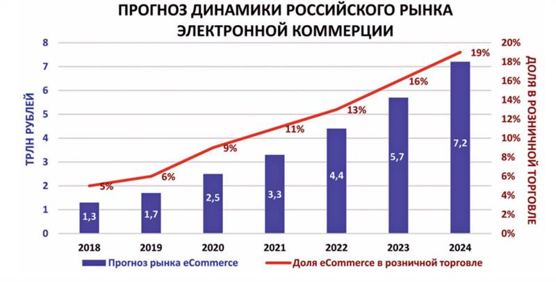 По оценкам АО «Почта России»380, за последнее десятилетие в России про-изошёл рост числа пользователей интернета старше 16 лет с 25% до 75%, проникновение электронной коммерции в торговлю увеличится втрое за 6 лет, с сокращением приемлемого времени ожидания с 5–7 дней до 1–3 дней.
