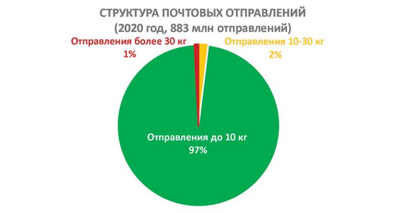 Вес 97% заказов не превышает 10 кг, что гарантирует возможность их рентабельной доставки лёгкими пилотируемыми и беспилотными воздушными судами, так как вес минимального рентабельного набора из 10–15 посылок на локацию не превысит 100–150 кг386 (рисунок 4.5).