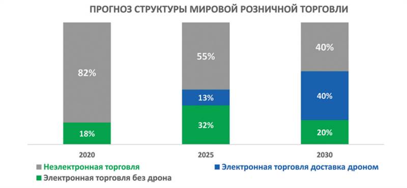 По данным McKinsey387, автономные транспортные средства в ближайшие 10 лет станут доставлять 80 процентов посылок, а доля дронов в обслуживании розничной торговли составит около 40%388 (рисунок 4.6). Стоимость доставки дроном в сельской местности будет всего на 10% выше стоимости традиционных моделей доставки, при точке безубыточности от ~10–15 посылок на местоположение. Данная точка безубыточности гарантированно достигается в населённых пунктах с численностью населения свыше 500 человек. По международным нормативам, такие пункты должны иметь наземную инфраструктуру и для лёгких воздушных судов.