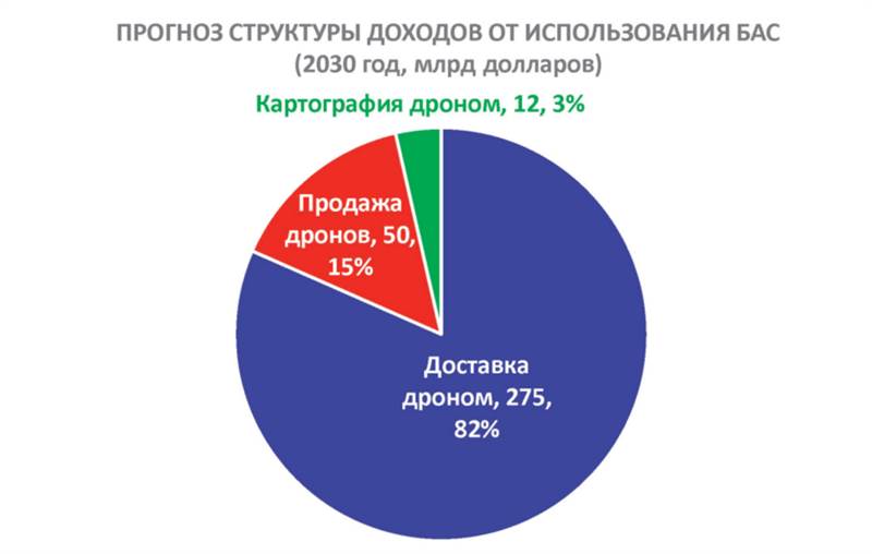 Дополнительный потенциал для развития этого рынка создаст использование авиационных технологий для развития офлайн составляющих социальных онлайн сервисов (медицина, образование, госуслуги и т.п.), а также для развития внутреннего туризма. ARK Investment Management LLC прогнозирует389 к 2030 г. рост доходов только от доставки дроном до $275 млрд (рисунок 4.7).