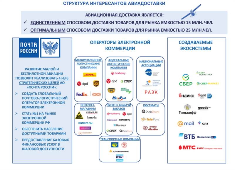 Реализация четырех из шести стратегических целей экосистемы АО «Почта России»391 напрямую зависит от решения вопроса дешёвой и быстрой доставки товаров по всей территории страны. Это предполагает применение недорогих ЛА, использующих простую наземную инфраструктуру.