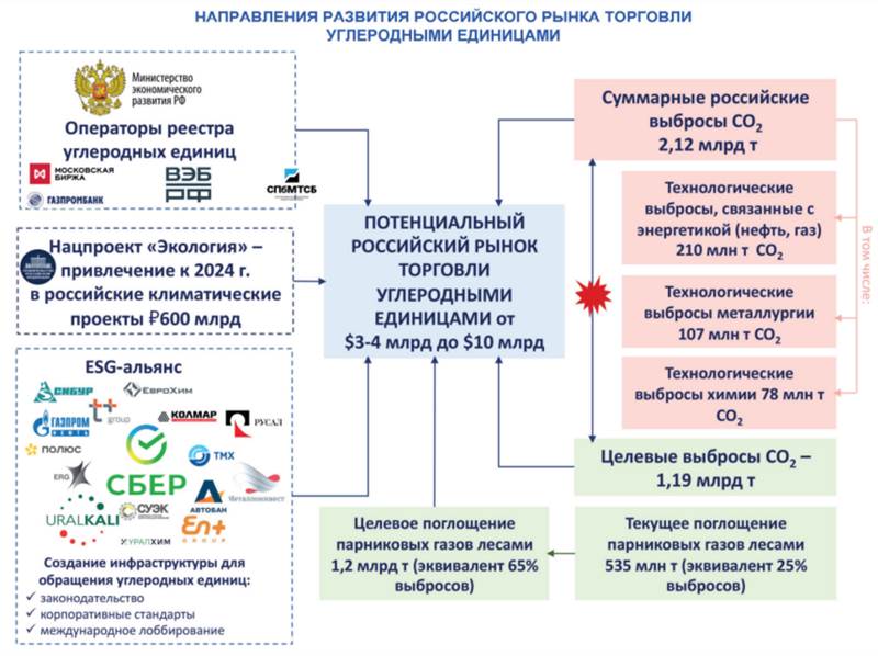 Таким образом, консорциум заинтересованных органов государственной власти и корпораций может предложить международным структурам достижение быстрого и статистически значимого результата (необходимого им на начальной стадии проекта для демонстрации собственной состоятельности), а также организовать PR-компании, позиционирующие Россию как абсолютного лидера мировой декарбонизации и зелёной экономики.