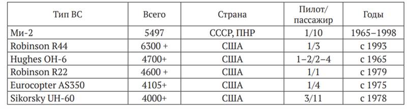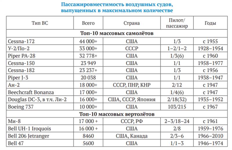 Технико-технологические особенности воздушных судов малой авиации позволяют обеспечить выпуск десятков тысяч машин. Так, например, до 1981 года отечественная промышленность выпустила почти 60 тыс. лёгких самолётов398.8 из 10 самых массово выпускаемых самолётов и 9 из 10 вертолётов являются воздушными судами малой авиации (таблица 4.7).