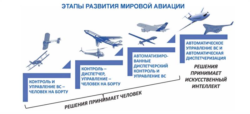 Человечество вплотную подошло к грани, когда управление воздушными судами и организацией воздушного движения (ОрВД) должно перейти от человека к искусственному интеллекту400 (рисунок 4.16). Если сегодня безопасным движением самолёта в воздухе управляет экипаж, совместно с диспетчером управления воздушным движением, то согласно программам модернизации авиатранспортных систем США (NextGen) и Евросоюза (SESAR), в горизонте до 2035 года предполагается постепенное замещение искусственным интеллектом и экипажа, и службы управления воздушным движением401.