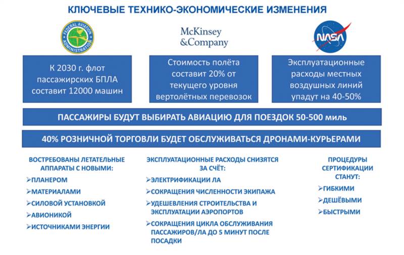 –городская воздушная мобильность (UAM). Для беспилотных транспортных средств будут сформированы правила использования воздушного пространства, обеспечена сертификация их лётной годности, решена проблема предотвращения столкновений на аппаратном и организационном уровнях. Будут также созданы взлётно-посадочная инфраструктура, система зарядных станций и иные инфраструктурные объекты поддержки UAM.